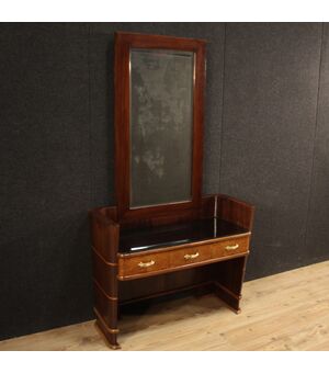 COD 8833 Psiche italiana di design degli anni 70. Mobile di bella linea e piacevole arredamento in legni di noce, palissandro, radica, acero e faggio. Psiche costruita in due corpi separabili per facilitarne lo spostamento in casa. Mobile finito da centro, munito di tre cassetti frontali e piano...