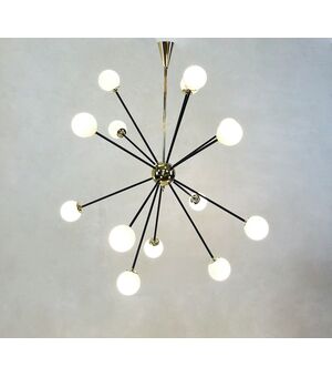 Elegante lampadario vintage 1970 a 14 fuochi interamente in ottone e opalina . Epoca : 1970 Provenienza : Italia Dimensioni : Diametro 120 Altezza 130 cm