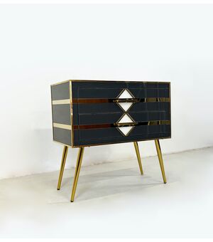 Particolare comodino Vintage 1970 interamente in vetro colorato grigio scuro con dettagli in ottone. Caratterizzato da due cassetti frontali con interni in ebano laccato nero. Dimensioni: L 77 x P 43 x H 76 cm Provenienza: Italia Epoca: 1970