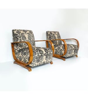 Particolare coppia di poltrone Art Decò 1940 con braccioli curvi in legno di noce, ben tenute nonostante lievi segni del tempo.  Il tessuto è caratterizzato da decorazioni damasco in velluto tagliato operato tessuto a mano su telaio Jacquard. Epoca: Anni 1940 Dimensioni: H 79 x P 78 x L...