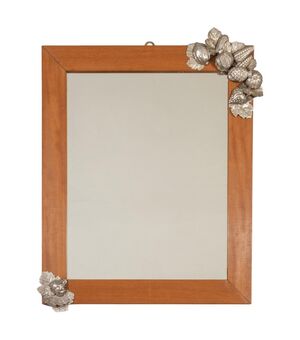 Piccola specchiera in legno di noce con applicazione di frutta in metallo argentato in due angoli. Le seconde misure comprendono le sporgenze delle appliazioni: Misure: cm. 60,5/66,5    x   50/54 cm.      x spess. cm. 2/5.