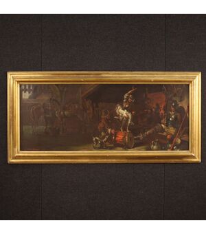 COD 8642  Dipinto italiano della prima metà del XX secolo. Opera ad olio su tela, in prima tela, raffigurante osteria in stile settecentesco con personaggi e cavalli. Quadro di grande piacevolezza firmato in basso a sinistra Mattia Traverso (vedi foto), mancante di autentica. Cornice lignea...