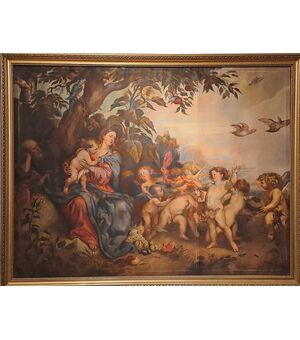 Scheda Descrittiva dell'Opera: Riposo durante la Fuga in Egitto Soggetto: Riposo durante la Fuga in Egitto (Sacra Famiglia con Angeli/Putti). Tecnica: Olio su Tela (o tessuto con trama visibile, come da dettaglio). Periodo : XX sec. Analisi Stilistica e Iconografica 1....