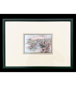 Dipinto olio su tavola raffigurante paesaggio con fiume.Firmato.Cornice: Cm 52x37.Dipinto:cm 20x14.