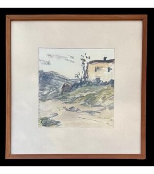 Acquarello-carboncino su carta raffigurante paesaggio rurale con casa.firmato con iniziali.Cornice cm:40x39.Dipinto cm 22x21.