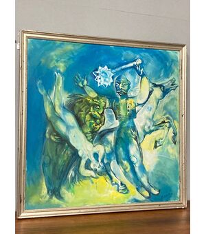 Grazioso dipinto ad olio su tavoletta lignea, inserito in una cornice di legno intagliato e dipinto. Nel dipinto è raffigurata una veduta paesaggistica con mare e montagne, dalla quale si intravede una marina con una città nelle vicinanze, probabilmente la marina di Pizzo Calabro, che richiama le...