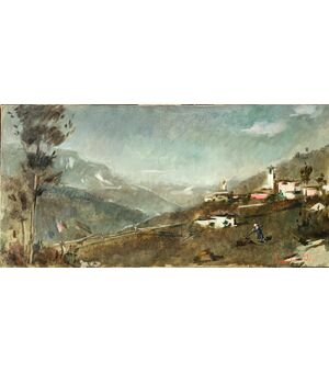 "Valle Brembana", panorama dalle alture di Costa San Gallo, sopra San Giovanni Bianco. Olio su tela di cm.60 x 120, opera di Luigi Locatelli detto Bigì (1904-83), membro tra i più dotati della famiglia Locatelli di Bergamo, tre generazioni di artisti d'eccellenza di cui 8 pittori e 1 scultore...