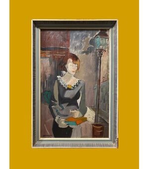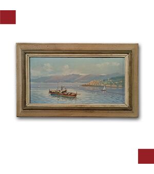 Grazioso dipinto ad olio su tavoletta lignea, inserito in una cornice di legno intagliato e dipinto. Nel dipinto è raffigurata una veduta paesaggistica con mare e montagne, dalla quale si intravede una marina con una città nelle vicinanze, probabilmente la marina di Pizzo Calabro, che richiama le...