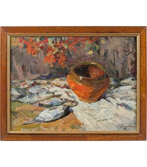 Lev Pavlovich Khodchenko (Shimanovka, 1912 - 1998) - Natura morta di pesci e vaso. 60 x 80 cm senza cornice, 72 x 92 cm con cornice. Olio su tela, in cornice in legno. - Opera firmata in baso a dx. - Opera firmata e datata al retro: “1963”. Condition report: Tela originale. Buono stato di...