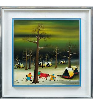 Duska Markotić (Croazia, XX sec.) - Paesaggio invernale. 50 x 50 cm senza cornice, 69.5 x 69.5 cm con cornice. Olio su tela, entro passe-partout in cornice in legno. - Opera firmata in basso dx: “D. Markotić 1973.” - Autentica al retro: “Meeting Art Srl - D’Inverno nei campi - 24-11-1973....