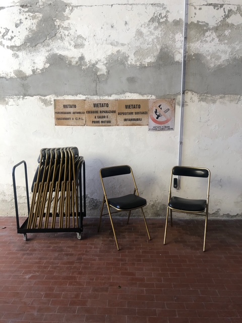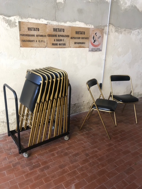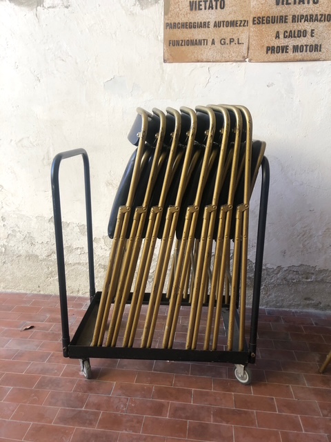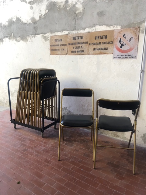 Set di n.10 sedie da teatro o cinema (erano i posti sotto il palco, che si dovevano poter togliere quando c'era l'orchestra), in ottone dorato e pelle nera, molto belle e in buono stato conservative, sono apribili e trasportabili grazie al carrellino originale che le trasportava