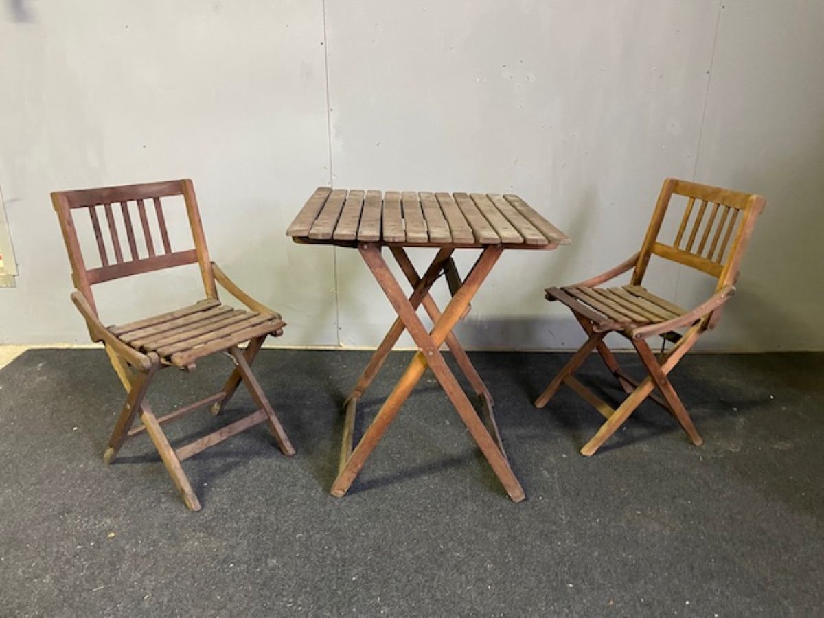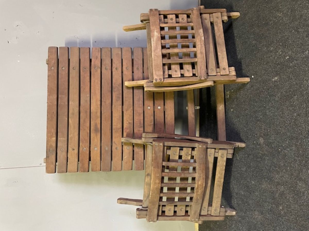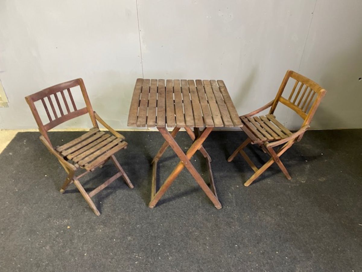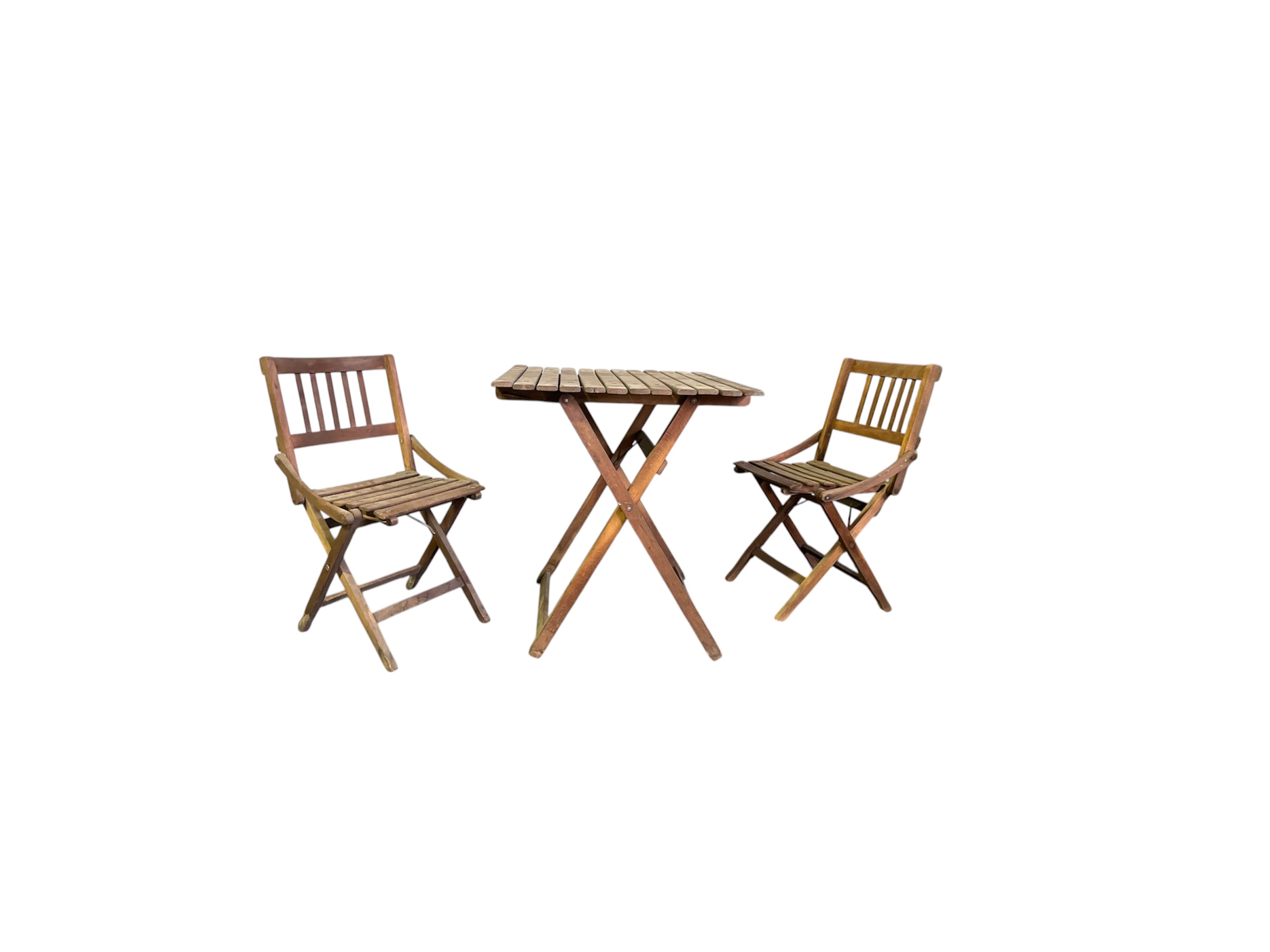 Set vintage di arredo giardino da bambini, composto da 2 sedioline e tavolino, originali del mobilificio Fratelli Reguitti di epoca metà '900. Completamente richiudibili con bellissimi meccanismi in ferro e legno in patina stupendo. Venduti in set. Misura sedia L 40 x P 37 x H 65 in cm